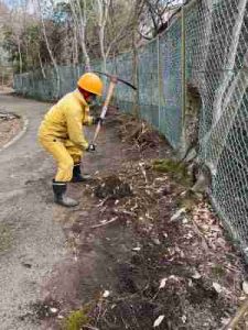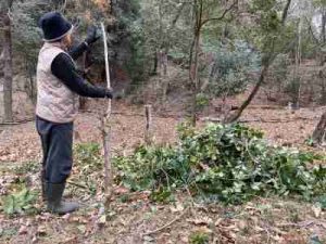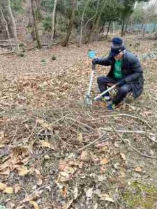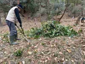 太い根は手で引き抜けないので、ツルハシで切断します。